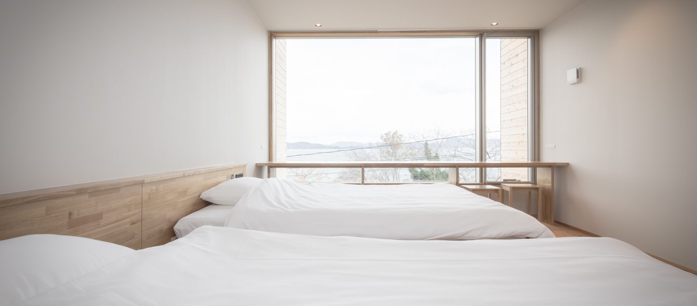 2Fから眺める美しくきらめく海、浴槽からは山側の緑も感じることができます。また、2Fに位置しているため「屋上テラス」に近く、豊島ならではの豊かな自然と時間を存分に体感していただけるお部屋です。