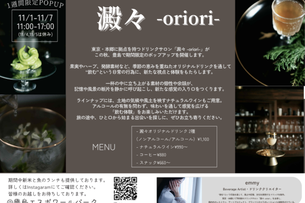 The Tokyo- and Hongo-based drink salon “Oriori” will hold a special limited-time pop-up this autumn at Teshima.